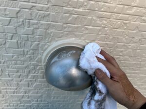 養生が終わったら、外壁の塗装に入っていきます!今回はクリアーの塗装になります!このようにクリアー塗装では色が付くわけではないので塗った箇所がわかりにくいです。ですが、昼間でも明るいヘッドライトをつける