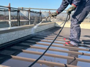 今日からまたあらたな現場が始まります!まずは高圧洗浄からです!今回のお客様はクリアー塗装なので、丁寧な高圧洗浄がそのまま仕上がりに直結するので腕の見せ所です!!このように洗浄をする前にコケを全体的にブ