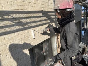 先日外壁のクリアー塗装が終わったので、コーキングの施工に入っていきます。クリアー塗装は、普通の塗装と違って、コーキングの上に施工できない為クリアー塗装完了後にコーキングを打っていきます。特殊な形をした